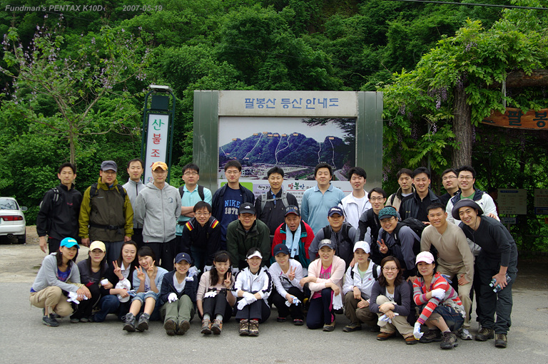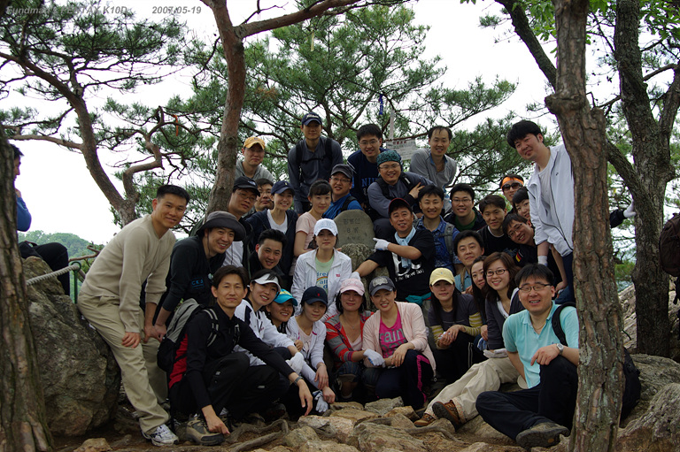 미래에셋증권 퇴직연금본부 전원이 등정에 성공한 팔봉산 제 8봉 정산에서의 단체 샷. 온통 바위 투성이에 전체 코스의 1/3이상이 밧줄이 없이는 코스 진행이 불가할 정도로 험한 산을 그것도 비온 다음날 올라가다니, 음, 좀 무리한 진행이었지만 종종 오버할때 그만큼 재미도 있다는…