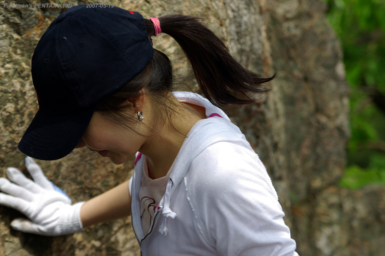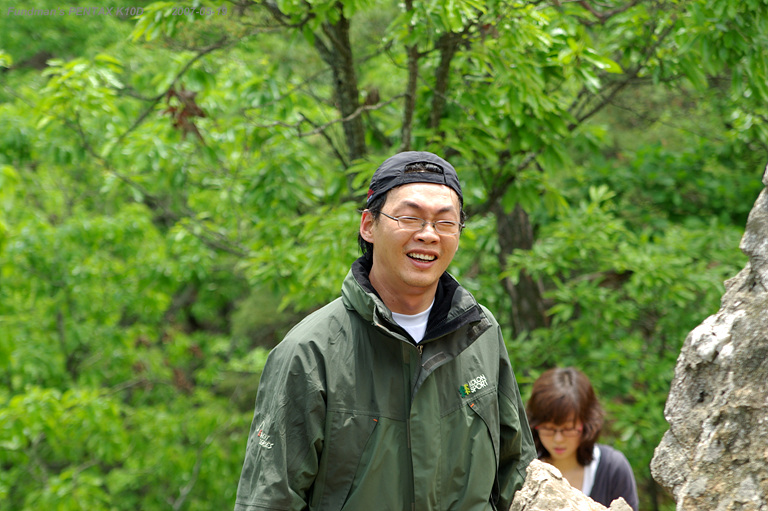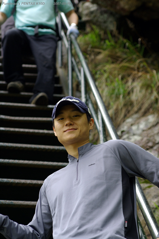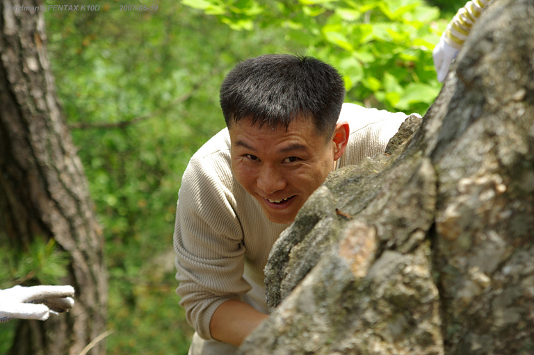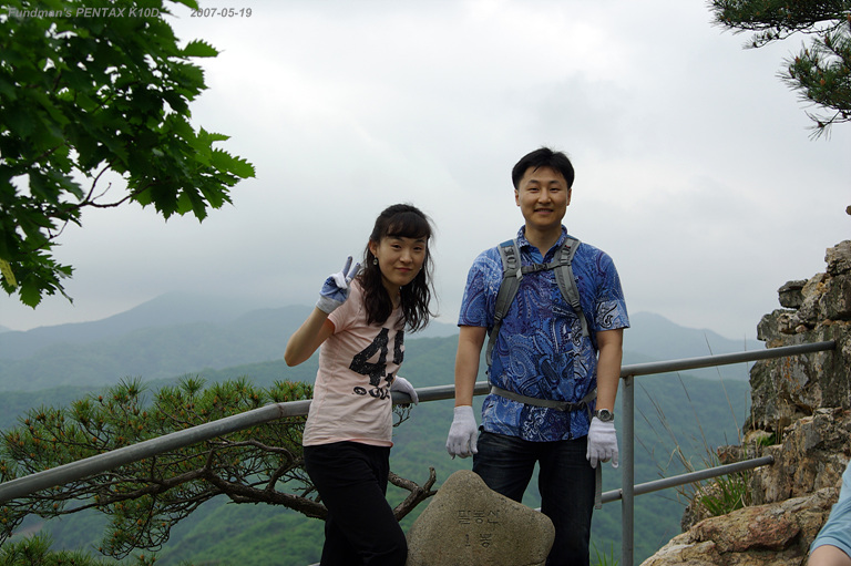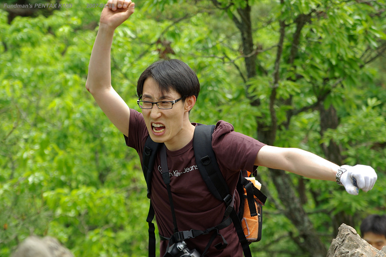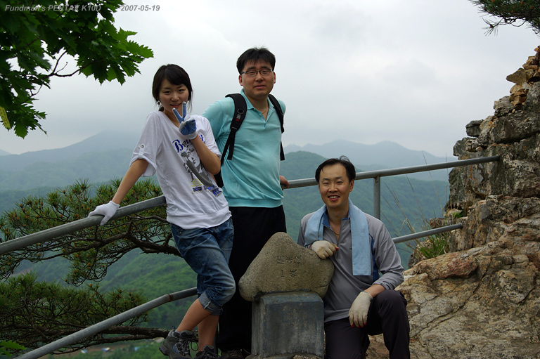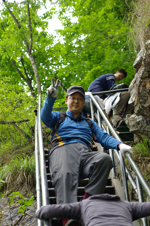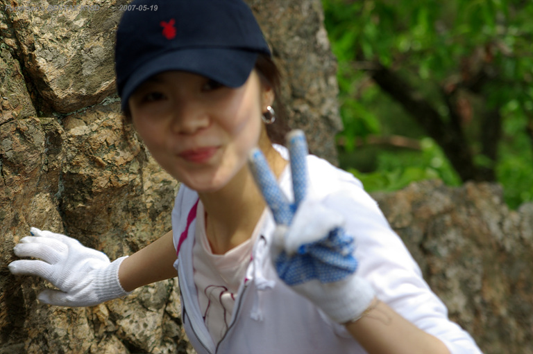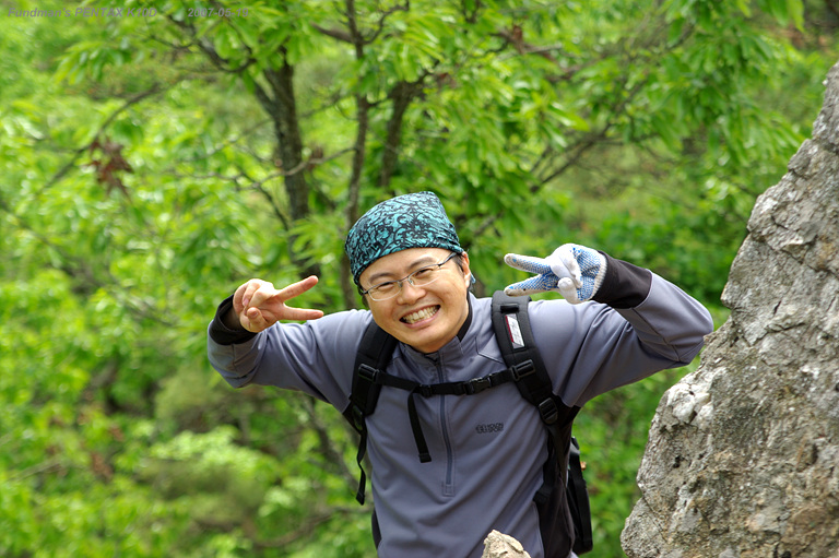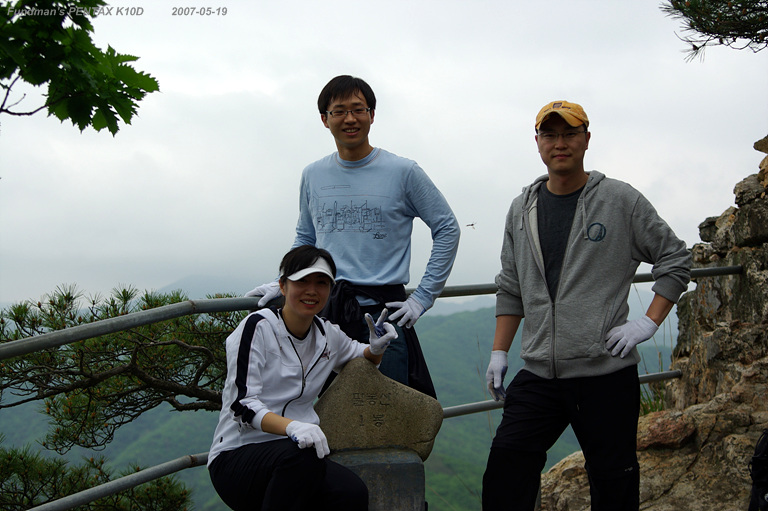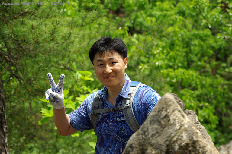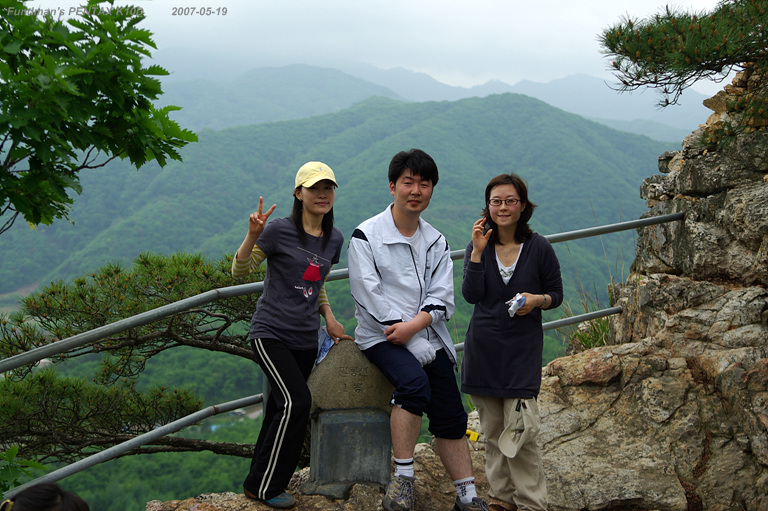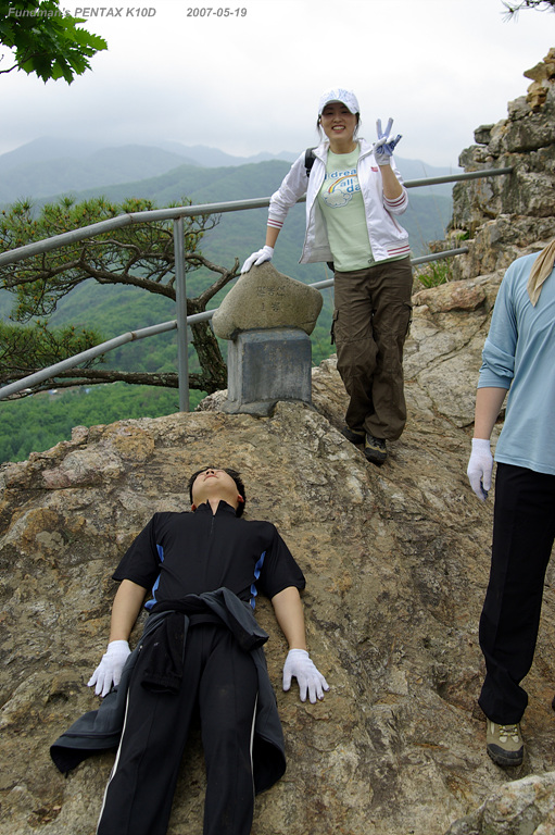 제1조의 제1봉 도착 기념 샷. 각 조는 리더 1명과, 포터 1명, 그리고 여직원 1명으로 구성. 사진포즈라 브이를 그리고는 있지만 난생처음 산행치고 너무 난코스를 경험하게 되어 다시는 산을 타지 않겠다고 다짐했다는 민선씨.