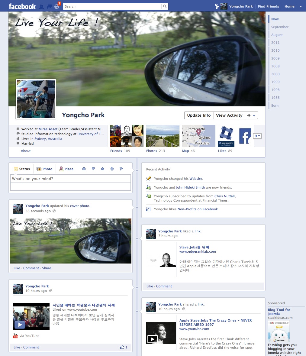 Facebook Timeline First ImpressionCool~페이스북이 마이크로 블로그로 다시 태어났군요. 첫인상은 좋습니다. 타임라인 뒤에 있는 Open Graph가 불러올 SNS 마케팅에 대한 엄청난 충격이 꽤 기대됩니다.TimeLine을 일찍 경험해 보고 싶은 분이 많으시죠. 페북 개발자에게는 먼저 경험할 수 있는 길이 열려있더군요. 자세한 내용은 구글신에게 … 아시죠?