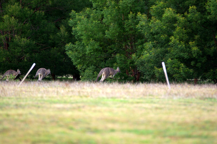 녀석을 쫓아 캠핑장 앞의 풀밭으로 나왔더니 캥거루가 천지네요. 새끼들을 거느리고 달려가는 어미 캥거루입니다.