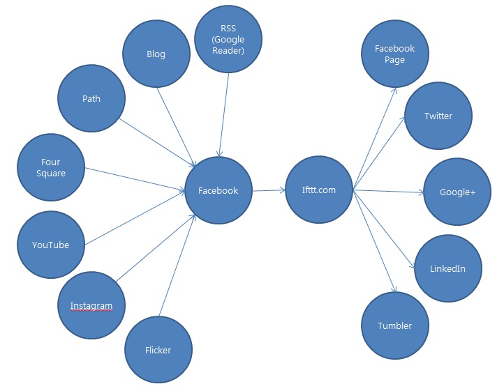 – Left half depends on each service’s optional function to link any action to FB, right half depend upon ifttt.com, which help automatic transferring of update from FB to other SNSes.